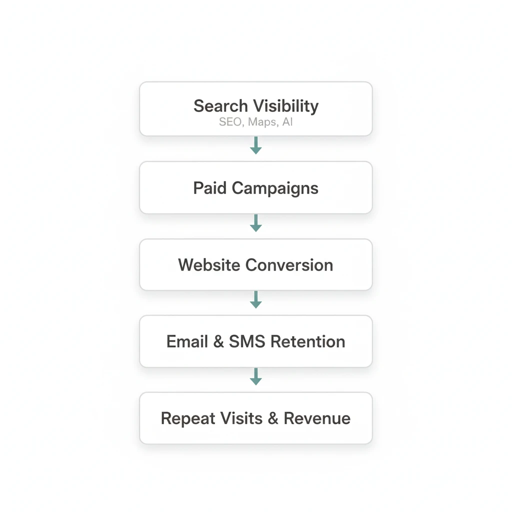 Search visibility feeds paid campaigns. Paid campaigns drive traffic to high-performing websites. Websites convert guests into subscribers. Email and SMS drive repeat visits. Social content reinforces awareness across every stage.
