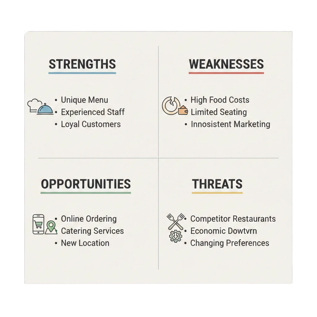 A SWOT analysis provides a structured way to evaluate these internal and external factors, helping restaurant owners and managers see their business more clearly.